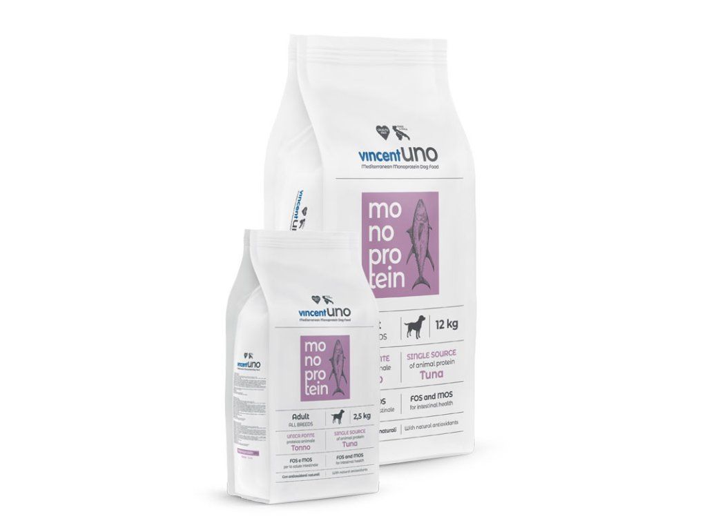 Vincent Uno Monoprotein Tuniak je kompletné a vyvážené suché krmivo s jedným zdrojom živočíšnych bielkovín, ideálne pre dospelých psov s predispozíciou k potravinovým intoleranciám. Receptúra využíva starostlivo vybrané zložky s integráciou prírodných antioxidantov na posilnenie imunitného systému a s prebiotikami MOS a FOS, ktoré podporujú zdravie čriev a pomáhajú obnovovať bakteriálnu flóru.